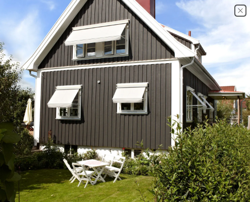 Enyrooms egenutvecklade fönstermarkis med liten stilren fyrkantig kassett, passar moderna hus så som äldre hus.